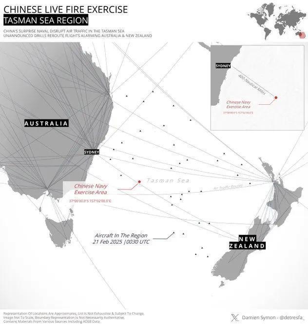 当然,西方媒体秉承一贯的有色眼镜,依然渲染说中国海军舰队的实弹射击提前通报的时间不够,“导致了几架原计划经过该海空域的民航客机被迫改变航线”。据报道,一架从澳大利亚悉尼飞往新西兰基督城的阿联酋航空航班被中国军舰直接拦下,警告该飞机与中国军舰的演习海域保持至少35公里的距离。澳大利亚航空公司和新西兰航空公司目前已经更改其飞越塔斯曼海及周边地区的航线,
