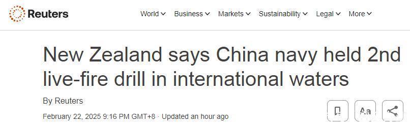有意思的是,新西兰也在抱怨在中国海军实弹射击演习中“很受伤”。新西兰防长柯林斯表示,中方未就“派遣能力强大、攻击力巨大的舰队开赴澳大利亚东部海岸提前发出通知。她22日还联想说,中国去年朝南太平洋海域发射一枚洲际导弹时,仅提前24小时前通知新西兰,她希望双方缺乏沟通的情况不会成为“新常态”:“保持对话一向重要,这并非我方以往预期中方会有的举动,但自从洲际导弹发射以来局势已更紧张,令人遗憾。”